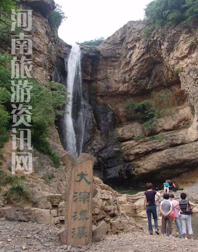 歡呼聲中,四五十余米高的大淙潭瀑布飛射而下,堅硬的巖石,把水雕琢成無數(shù)的珍珠,潮濕的薄霧圍繞周圍,蔚為壯觀!