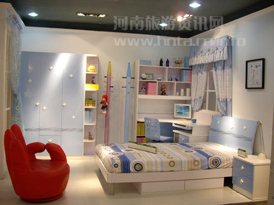 這間兒童房整體色調以淡藍色為主,給人以嫻靜地感覺。房內家具一應俱全,淡藍色點綴 有小星星的衣柜、白色加藍色的學習桌和儲物柜、舒適的小床和小巧的床頭柜、紅色的手掌軟椅,讓人感嘆現(xiàn)在的小孩太幸福了。