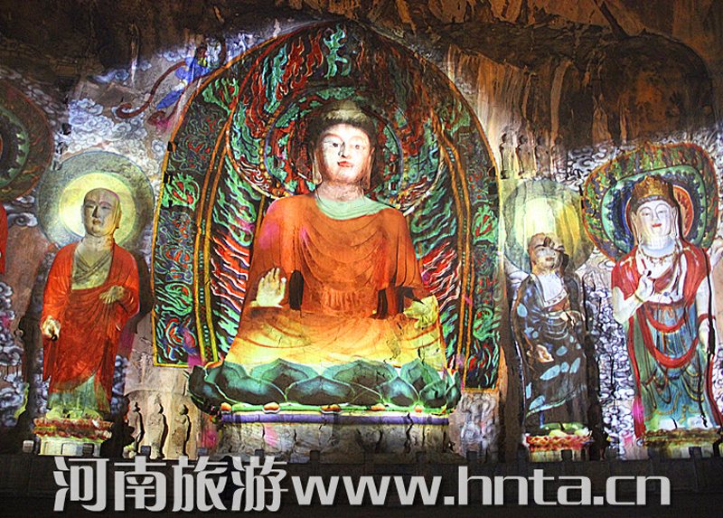 “夜游龍門”從景區(qū)停車場(chǎng)開始,各種燈具將景區(qū)外的生態(tài)停車場(chǎng)、景區(qū)商業(yè)街和景區(qū)綠地照耀得燈火輝煌。進(jìn)入西山窟區(qū)后,賓陽(yáng)三洞、摩崖三佛、萬(wàn)佛洞、蓮花洞等主要洞窟內(nèi)金碧輝煌。東山禮佛臺(tái)正前方的水中央,九盞蓮花燈玲瓏剔透,大者直徑達(dá)到7米。龍門東山半山腰的香山寺恍如玉宇仙閣。除了燈光藝術(shù)外,龍門景區(qū)夜游項(xiàng)目還有武皇禮佛、琵琶演奏、古箏表演等活動(dòng)。圖為龍門景區(qū)奉先寺盧舍那像龕。