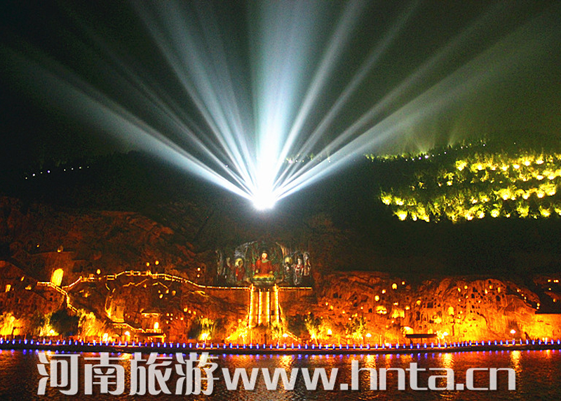 “夜游龍門”從景區(qū)停車場開始,各種燈具將景區(qū)外的生態(tài)停車場、景區(qū)商業(yè)街和景區(qū)綠地照耀得燈火輝煌。進入西山窟區(qū)后,賓陽三洞、摩崖三佛、萬佛洞、蓮花洞等主要洞窟內(nèi)金碧輝煌。東山禮佛臺正前方的水中央,九盞蓮花燈玲瓏剔透,大者直徑達到7米。龍門東山半山腰的香山寺恍如玉宇仙閣。除了燈光藝術(shù)外,龍門景區(qū)夜游項目還有武皇禮佛、琵琶演奏、古箏表演等活動。圖為龍門景區(qū)。