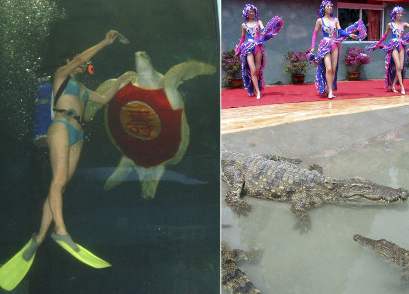 客流量對(duì)景區(qū)是實(shí)實(shí)在在的吸引,景區(qū)使出渾身解數(shù)招攬顧客。2005年4月30日,廣西北!昂5资澜纭钡谋硌莩刂,一只三百多歲高齡、重達(dá)300多斤的老海龜與潛水小姐共舞,成為海濱旅游城市北海的一個(gè)獨(dú)特旅游節(jié)目(左圖)。2002年“五一”前夕,南京的一家公園請(qǐng)來巨鱷與泳裝小姐“共舞”以吸引游客(右圖)。