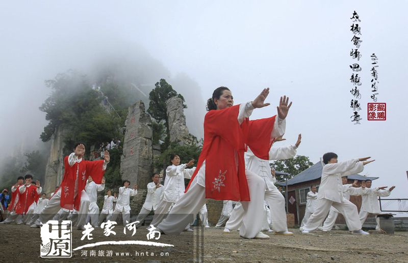 天下第一鐵頂,祈福問道圣地,孕育風光無限,探秘太行圣境。日前,太極高手相聚天界山景區(qū),進行了一場前所未有的立體展演。太極拳、太極劍、太極扇、太極球、太極推手、太極拂塵等傳統(tǒng)太極項目在太行巔峰圣境回龍▪天界山精彩上演。