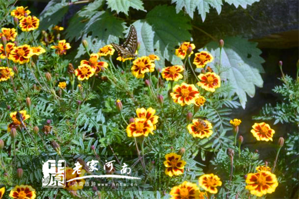 在九蓮山的山道旁,一朵朵黃色的山花吸引了蝴蝶翩翩飛來,山澗彌漫著陣陣花香.......