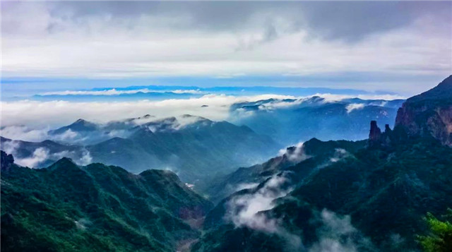 云蒸霧繞時,山腰形成云海,千山峰尖,出露云霧之中,宛如云海中小島,風吹幻化,千姿百態(tài)。