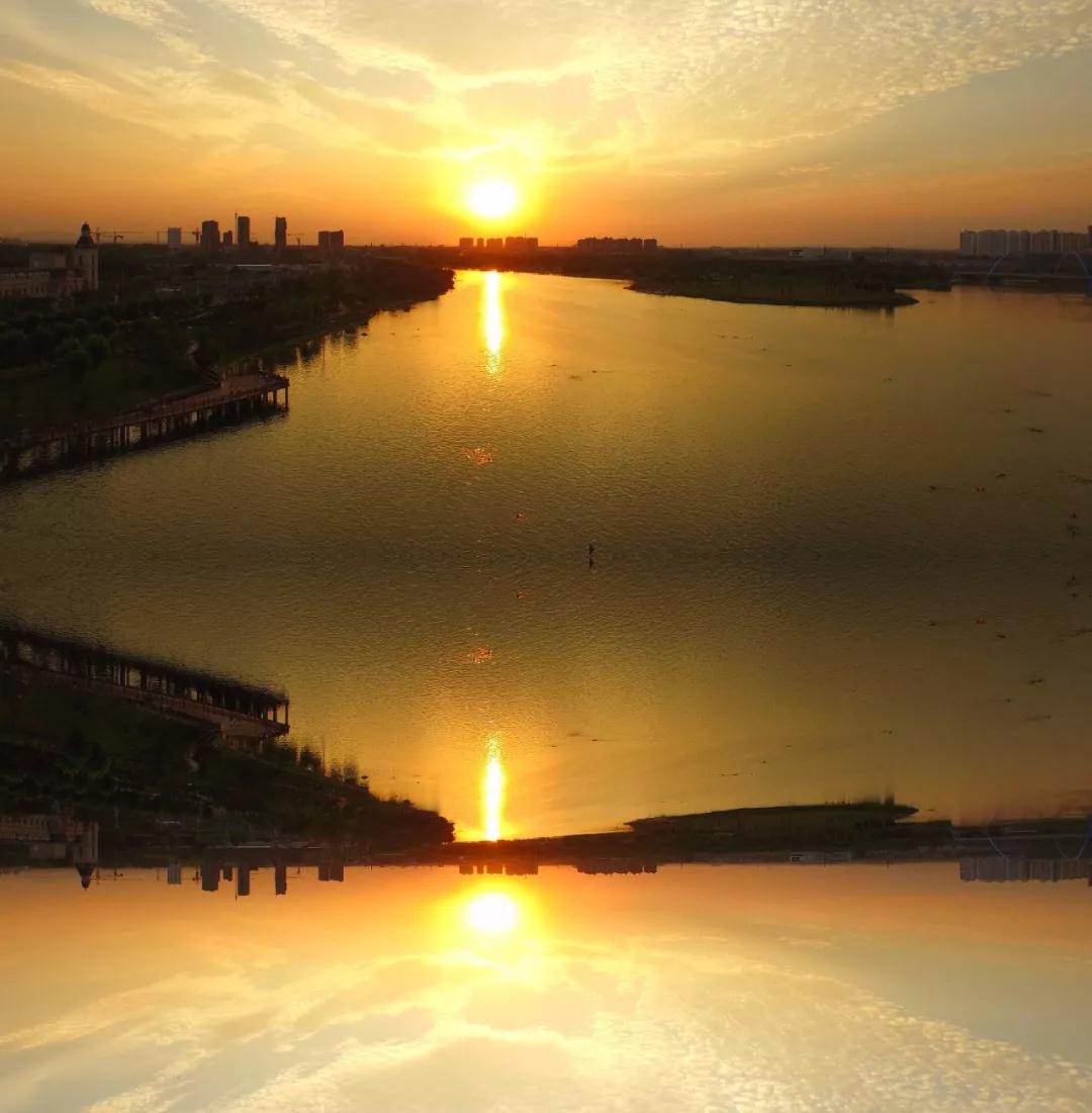 鏡中軒轅湖,夕陽(yáng)漸漸接近地平線,霞光從地平線暈染開來(lái)。