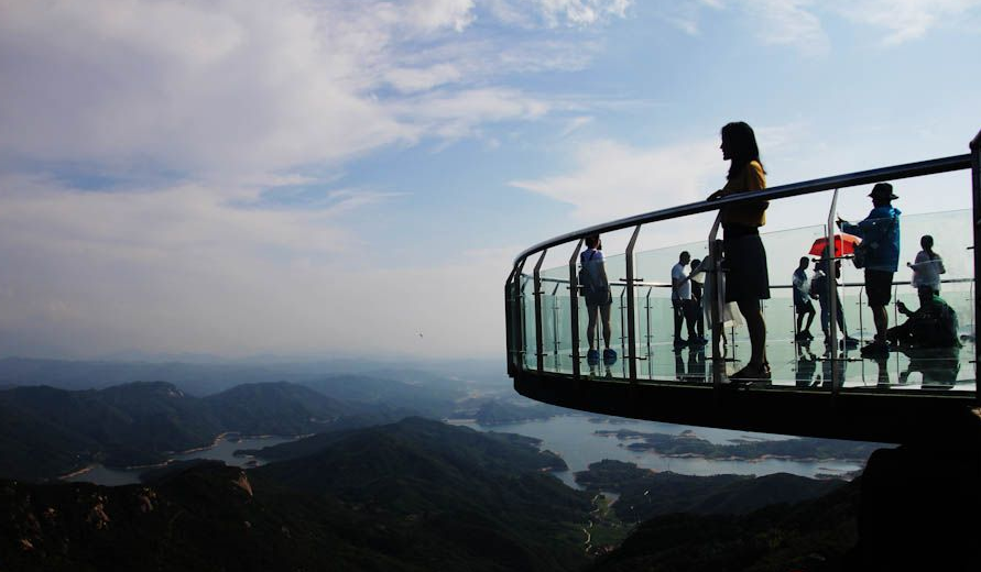 天空之境建于獅子峰主峰下“繡球山”頂?shù)母呖站扌筒Aв^景平臺,整個玻璃觀景臺成圓形,是用透明度極高的鋼化玻璃打造,透明如鏡,平鋪空中。