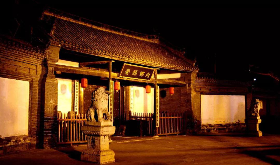 面闊三間的縣衙大門,被燈光照耀的威嚴雄維,大門兩邊的八字墻,格外搶眼,內(nèi)鄉(xiāng)縣署四個大字閃閃發(fā)光,兩只石獅威武霸氣地看守著大門。