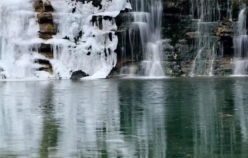 黃龍?zhí)妒翘一ü鹊木A所在,夏日里溪水叮咚,潭水清澈見底。冬季黃龍?zhí)兑怀乇趟琅f在,巖崖上方增添了不規(guī)則的冰雪圖案相伴。