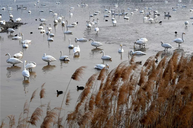 目前,到三門峽黃河濕地越冬的白天鵝,已有近萬只。