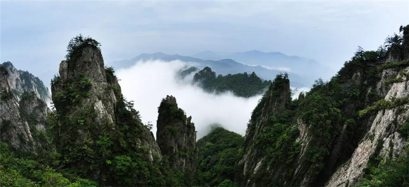5月底的老君山上,郁郁蔥蔥的樹木開始瘋狂生長(zhǎng),在十里畫屏內(nèi),這些綠色的生靈點(diǎn)綴在花崗巖山體之上,與層層的峰林相映成趣,在云霧的縈繞中,像不像精心裝扮的假山盆景杰作呢?所謂“擴(kuò)大的盆景,縮小的仙境”在這里得到了完美的體現(xiàn)。