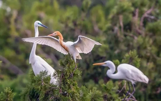 每天,鷺鳥們成群結(jié)隊(duì)地在小島上空翱翔,千姿百態(tài),美不勝收。鷺鳥們或盤踞枝頭,交頭接耳,竊竊私語(yǔ);或展翅飛翔,一鳴驚人。