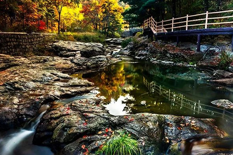霜葉猶紅,曲徑通幽漫無邊;淡云歸處,玉皇峰巔戀輕煙。隱見玉珠戲壁石,似在幽谷撫琴弦,露滋淺淺濕衣時,霞光已撒千壑間。瑞云鎖奇峰,疑似滄海仙島重現(xiàn);碧波飛流下,清冷幽溪珠光璀璨。