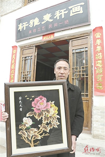 看著看著,記者被墻上的一副牡丹圖所吸引,用“遠(yuǎn)看山有色,近聽水無聲。春去花還在,人來鳥不驚”這首詩來形容一點(diǎn)都不過分。細(xì)看這幅用麥稈做的牡丹圖,四五朵鮮紅牡丹花,在數(shù)片翠綠的花葉映襯下盡情綻放,一根淡黑的花枝將它們連成整體,顯得分外嬌艷。整枝花斜倚在一塊淡黃色山石上,平衡了整個(gè)畫面的色彩。更讓人叫絕的是,兩只活潑的布谷鳥分別站立在石塊和花枝上,其中一只布谷鳥還扭著頭似乎在向另一只竊竊私語,整個(gè)畫面栩栩如生,生機(jī)勃勃。牡丹花、石塊、布谷鳥三物合為一體,使整個(gè)畫面栩栩如生,充滿生氣。乍一看去,怎么也不敢相信,這些都是用麥稈制作出來的。