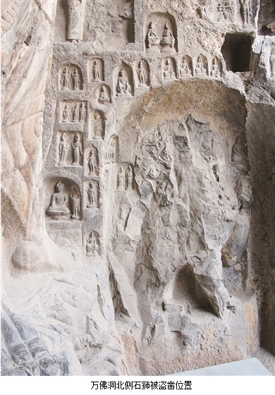 著名美術(shù)史論家宮大中在《龍門石窟藝術(shù)》中這樣記載:1965年,時(shí)任龍門文物保管所副所長(zhǎng)的馬玉清,曾將被脅迫盜鑿龍門文物的偃師楊溝石匠王光喜、王水、王惠成三人邀請(qǐng)到龍門,座談當(dāng)時(shí)盜鑿情況并尋找盜鑿地點(diǎn)。據(jù)這三人回憶,盜鑿時(shí)間在1930年至1935年,由該村偽保長(zhǎng)等人勾結(jié)洛陽(yáng)東關(guān)古玩奸商,采取欺騙與強(qiáng)制手段,迫使石匠們進(jìn)洞窟盜鑿。因怕驚動(dòng)龍門附近群眾揍他們,他們讓石匠們深更半夜摸進(jìn)洞窟,借助微弱燈光盜 鑿,還派土匪持槍放哨……