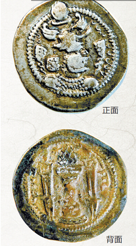 1955年,洛陽老城區(qū)北郊M30唐墓出土了17枚波斯銀幣。銀幣正面為臉向左側(cè)、頭戴王冠的王者半身像,背面中央為一蓮花座的祭祀火壇,兩側(cè)為祭司。正面王者像前后和祭司的后面都有文字。