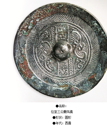 ●名稱: 位至三公夔鳳鏡 ●形狀:圓形 ●年代:西晉 ●出土地點(diǎn):洛陽(yáng)市澗西區(qū) ●收藏單位: 洛陽(yáng)市文物考古研究院 。看到的這面位至三公夔鳳鏡(直徑9.4厘米,緣厚0.22厘米,重110克),盡管看起來(lái)不復(fù)雜,卻蘊(yùn)含著諸多美好的祝愿。