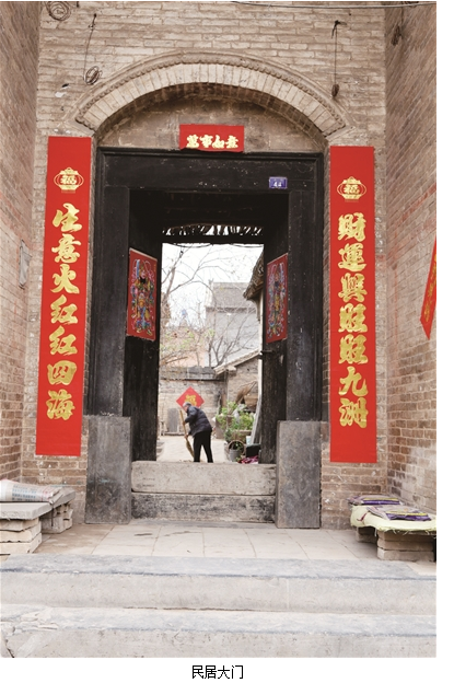 門楣上寫的“三槐世第”。迎門墻上還得貼上一個“福”字,下墜單條“出門見喜,大吉大利”。貼完了,細瞧瞧烏黑的大門上新貼的鑲著金箔邊的春聯(lián),煥然一新,此情此景令人喜出望外,拍拍身上的浮灰,高高興興關(guān)上大門進屋去。
