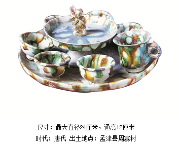 “七星盤”酒具,1976年于孟津縣周寨村出土,是盛唐時期的三彩套裝酒具。居中大盤內(nèi)豎著一個卷發(fā)、高鼻深目的胡人像。胡人手持的角杯,在古希臘、古羅馬文物遺跡中經(jīng)常見到,是當?shù)氐娜粘I钣镁,更是當(shù)厝擞脕砉┓罹粕竦募榔鳌?