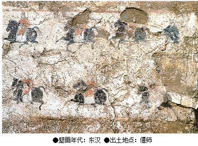 該壁畫被夾在二層的夾墻中,這可能是因?yàn)槔L制壁畫時(shí)墓主人地位較高,后來遭貶而地位降低,壁畫內(nèi)容與墓主人死前地位不符,恐上面降罪,于是采用二層夾墻的方法將壁畫掩藏起來。該壁畫為研究東漢的車騎導(dǎo)從制度及東漢的服飾提供了珍貴的實(shí)物資料。