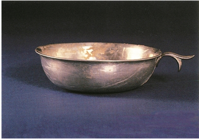 尺寸:口徑13.3厘米 高4.1厘米 時代:唐代 出土地點:偃師 。1984年,偃師唐代李景由墓出土了一件圜底碗形銀杯。從銀杯的造型看,在唐代以前的器物中找不到與其相似的,1964年西安出土的一件圜底碗形帶環(huán)形指鋬(pàn)的銀杯與之極為相似,而這件器物被確認是中亞輸入品,是中亞粟特人的酒具。略有不同的是,李景由墓出土的圜底碗形銀杯為葉芽形柄,這是從環(huán)形指鋬演變而來的。