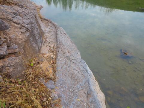 三郎洞對岸的河坡上,有一塊凸向河中的巨石,石上有一條圓潤拙樸的人工開鑿溝槽,看樣子像是遠(yuǎn)古時(shí)代的遺存。推斷不出來這條溝槽有什么用,為什么在這里開這樣一條槽。當(dāng)?shù)厝苏f,這就是大禹治水的遺跡。