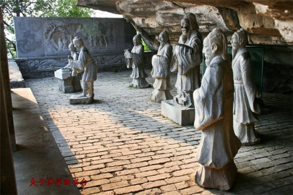 再說孔子到芒碭山來干什么?據(jù)芒碭山文廟記載著說是春秋末年,孔子帶領(lǐng)學(xué)生72個周游列國,一日來到芒碭山下時,天上突然下起大雨,孔子師生一時無措,只好躲進(jìn)山洞避雨,孔子自己的衣服被淋濕了,但他最關(guān)心的還是車上裝載的書籍。雨過天晴后,孔子讓弟子們把淋濕的書籍搬到洞外的平臺上晾曬,直到將書籍全部晾曬干后,才與弟子們又開始了新的行程。后來,孔子避過雨的這座山便被人們稱作夫子山,現(xiàn)在叫孔子避雨處,在其地建起了文廟,他率弟子曬書的那個石頭平臺也被人稱做曬書臺,現(xiàn)在的文廟是清朝修建的。