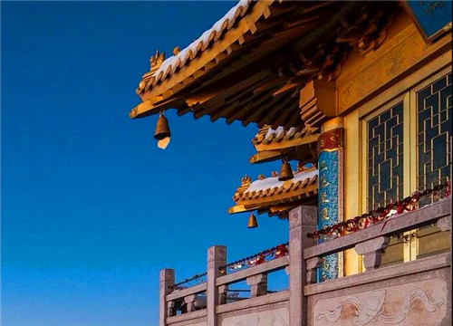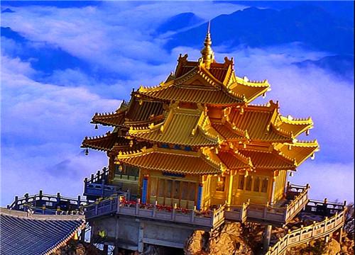 金殿又稱五母金殿,海拔2173米,與亮寶臺(tái)、玉皇頂呈三角之勢(shì),巧妙構(gòu)成了二龍戲珠的壯觀圖案。不僅是觀賞山景的絕佳之處,而且以其獨(dú)特的造型,成為金頂?shù)烙^群的畫龍點(diǎn)睛之筆。