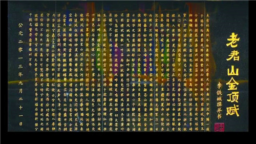 金頂賦碑立于金殿下,高1.89米,寬3.5米,花崗巖石材,由著名詞賦家李鐵成先生撰寫碑文并書丹,偃師孫少瑜刻石,2013年9月21日立石。