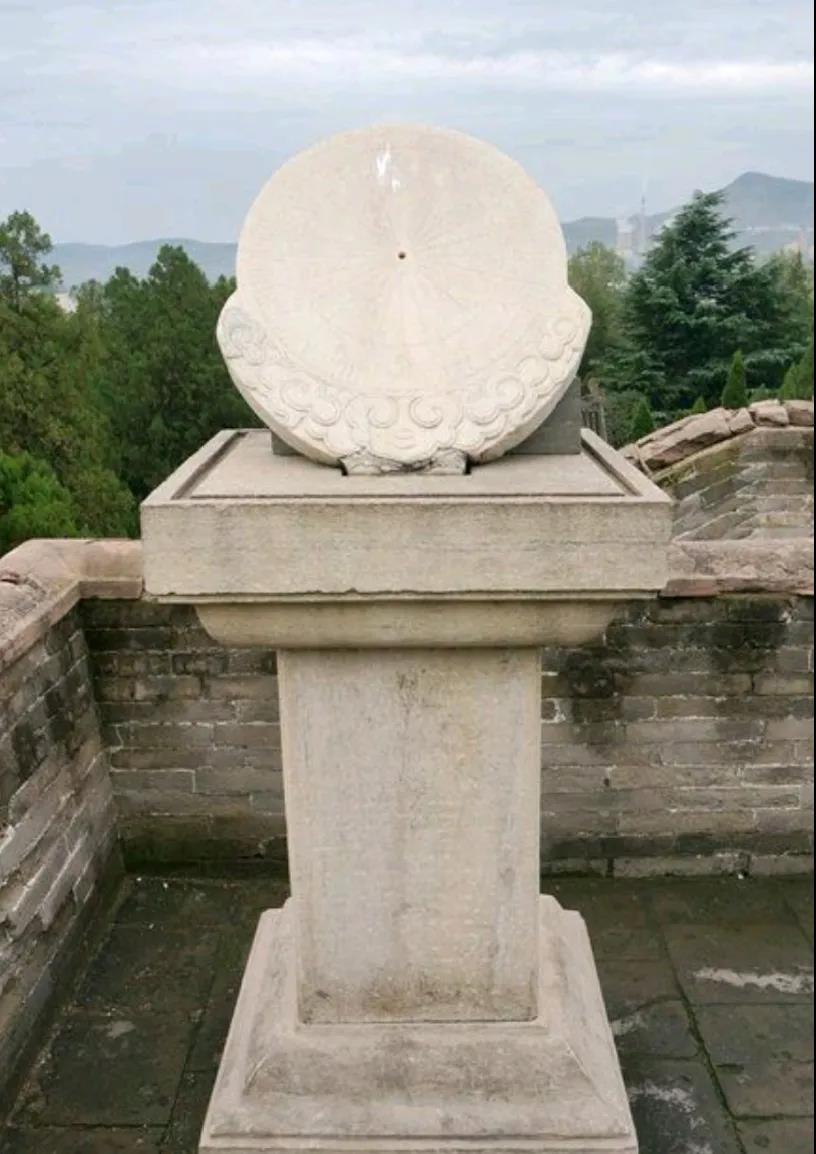 登上觀星臺(tái),可以看到日晷,原本由銅制的指針和石制的圓盤(pán)組成,可惜指針已經(jīng)丟失。指針垂直穿過(guò)圓盤(pán)中心,圓盤(pán)南高北低,平行于赤道面,與“圭表”的原理基本相同。日晷兩面都有刻度,分別為子、丑、寅、卯、辰、巳、午、未、申、酉、戌、亥十二時(shí)辰,每個(gè)時(shí)辰又等分為“時(shí)初”和“時(shí)正”,正好是一天的24個(gè)小時(shí)。