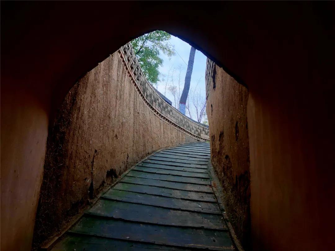 其中一孔窯洞內(nèi)有一條斜坡通道拐個(gè)弧形直角通向地面,是人們出行的門洞。