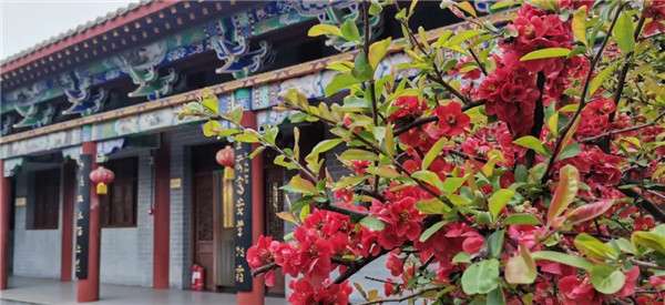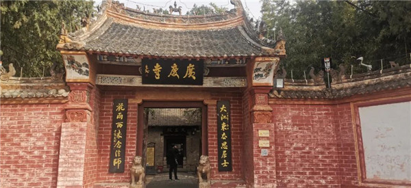 沿著柏油路一路向北,就到達了廣慶寺。門前“大江東去思居士,花雨西來念法師”的對聯(lián)赫然入目。王曉鋒說,廣慶寺原是宋仁宗頒旨修建的,建筑風格獨特,最明顯的特征是一進三院、寺祠合一,據(jù)說,這在全國都極為少見。