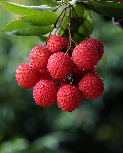 荔枝樹,高五六丈余,如桂樹,綠葉蓬蓬,冬夏榮茂。青華朱實(shí),實(shí)大如雞子,核黃黑似熟蓮,實(shí)白如肪,甘而多汁,似安石榴。有甜酢者,至日將中,翕然俱赤,則可食也。一樹下子百斛。(《南方草木狀》)