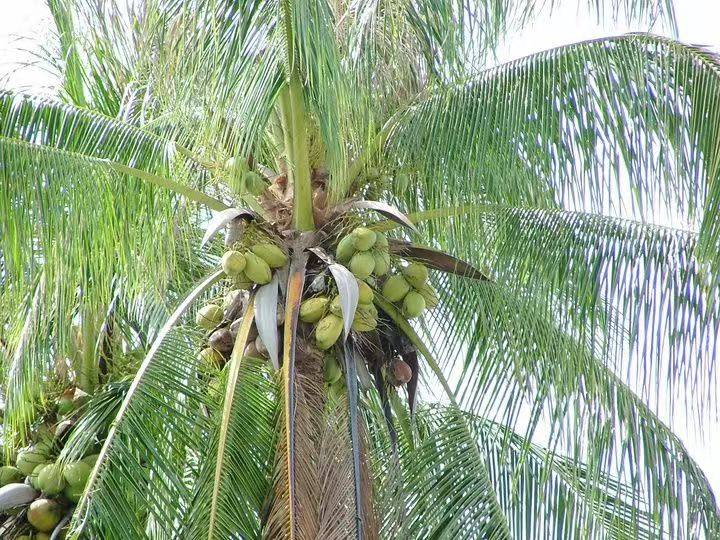 “葉如栟櫚,高六七丈,無枝條,其實(shí)大如寒瓜,粗皮,次有殼,圓而且堅(jiān);剖之有白膚,厚半寸,味似胡桃,而極肥美;有漿,飲之得醉。俗謂之越王頭。”(《南方草木狀》)