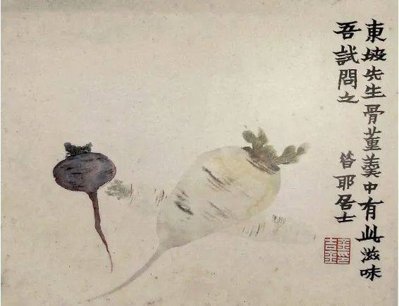 黃庭堅題南唐畫家徐熙的一幅《畫菜》曾云:不可使士大夫不知此味,不可使天下之民有此色;在中國的士人看來,口味最淡薄的蔬食中,存有的是關于生命之道最悠長的況味。圖為惲壽平 《蔬果冊八開之三》 紙本設色 廣東省博物館