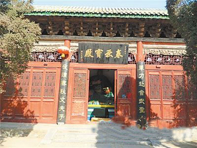 大殿內(nèi)的四壁上,貼有多幅朱仙鎮(zhèn)木版年畫,詳細(xì)介紹了關(guān)公的生平事跡,生動刻畫了騎赤兔馬手提青龍偃月刀的關(guān)公,過五關(guān)斬六將的英雄形象。