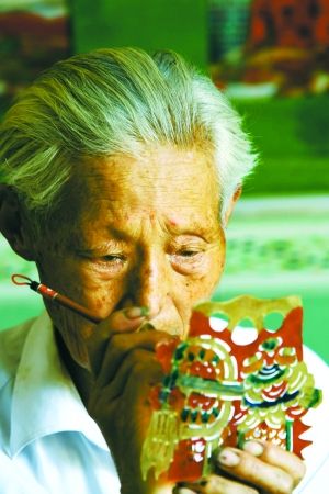 人老藝不老。80歲的“皮影泰斗”岳義成在為皮影著色