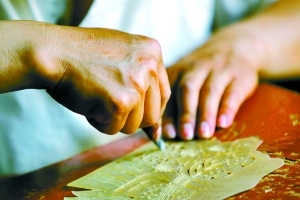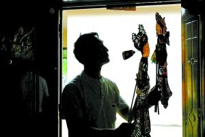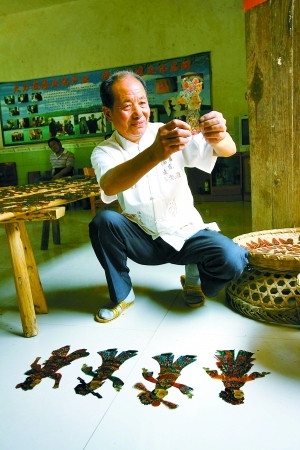 黃崇信在仔細(xì)推敲他制作的皮影造型