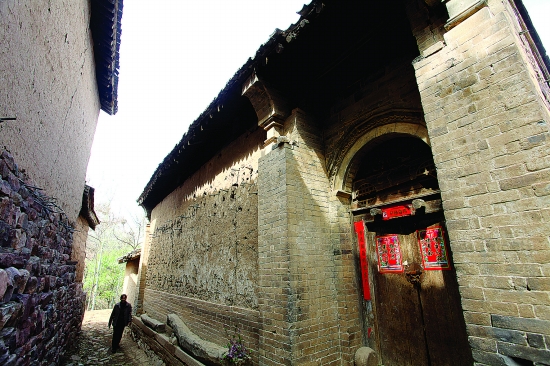 走在鋪滿羊屎蛋的村中小路上,不時有牛叫和鳥鳴聲傳來,讓人感覺仿佛置身于靜謐的山澗之中。整個村落依山勢而建,坐北朝南,錯落有致。民居以三合院、四合院居多,現(xiàn)在保存較為完整的有16套。院落因地形、地勢原因,大多占地100至200平方米不等,呈長方形,四周由上房、廂房、門房等圍成,青磚鋪地。建筑多為磚木結(jié)構(gòu),石條為基,以木立架,以土坯、青磚砌墻,灰瓦蓋頂,屋脊雕刻有鳥、魚、龍等獸。這些出于民間工匠之手的裝飾,具有特別濃厚的藝術(shù)氣息。不少院子門外還有上馬石、拴馬樁、養(yǎng)蜂箱。從門樓建筑可清楚地看到當年這些院主的身份、地位及文化修養(yǎng)和精神追求,門樓上的木刻、門枕石獅、石鼓等,無不顯示出當?shù)匕傩掌砬笃桨布椤⒈傩凹{福的樸實追求。