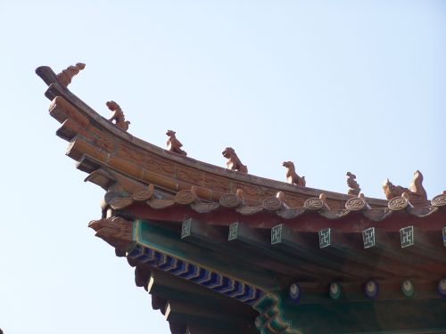 歇山屋頂與懸山和硬山又不一樣,除了正脊、垂脊之外,還多一個(gè)戧脊。所謂戧脊就是在垂脊的下半部還有一段正面與山面兩個(gè)屋面相交在平面上呈45度方向的斜向屋脊。值得一說(shuō)的是,歇山屋頂本身就比懸山、硬山式屋頂豐富,所以歇山屋頂?shù)乃膫(gè)戧脊往往都成為裝飾的重點(diǎn)。戧脊中段有垂獸,垂獸前排有小獸,而且數(shù)目繁多。多則有十多個(gè),少的有兩三個(gè)。至于小獸的種類更是應(yīng)有盡有,龍、鳳、獅、麒麟、牛、馬、羊、兔皆可。個(gè)別時(shí)候,戧脊上也可用文房四寶,這要根據(jù)主人的意愿和愛(ài)好而定。