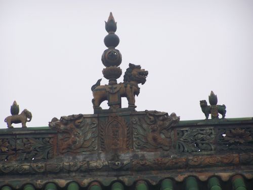 說(shuō)白了,正脊就是屋頂上的一條直線,可又不是一條普通的直線。它需要裝飾,需要賦予內(nèi)容,還需要有宏偉的氣勢(shì)與威嚴(yán)。所以,古匠人常常為此煞費(fèi)苦心,比如要在正脊上輔以吻獸和各種花卉裝飾等。開(kāi)封山陜甘會(huì)館正殿的正脊由磚雕的花紋作裝飾,這些裝飾是在一塊塊泥坯雕出花紋進(jìn)窯燒制成磚后,再在屋頂拼成長(zhǎng)條;梼(nèi)容為植物的花朵和枝葉,相同的花飾左右連成帶狀的雕刻裝飾。比較特殊的是在花飾之中有帶狀的兩對(duì)“二龍戲珠”圖案,正是這兩對(duì)“二龍戲珠”圖案使有些單調(diào)的花飾立即活躍起來(lái)。更為特殊的是,山陜甘會(huì)館正殿大脊的中央裝飾有面朝東方馱珠的瑞獸麒麟,在麒麟的兩側(cè)是兩個(gè)伴獸貔貅和大象。在麒麟的正下方還有一塊方形的琉璃大磚,磚上鑄有“城圣大帝”四字,這應(yīng)該是山陜甘會(huì)館大殿正脊最與眾不同的地方。山陜甘會(huì)館大殿正脊兩端則是兩個(gè)正吻,分別是兩個(gè)相對(duì)的張著大嘴翻卷龍尾的龍,兩個(gè)龍嘴銜著正脊,給人以威嚴(yán)的感覺(jué)。