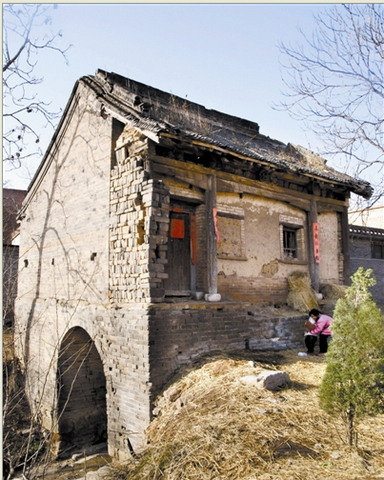 古寨門下部所砌磚石有大有小,說明它曾被重修過;上部磚塊整齊統(tǒng)一。面向打麥場一面的廊柱上方還依稀可見精美的木雕,據(jù)村中人介紹,它曾是一座戲臺,后被封閉改作他用。