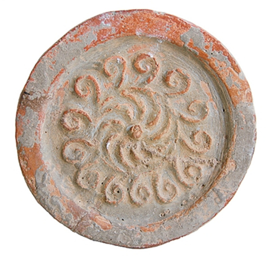 圖案作為傳統(tǒng)裝飾的重要形式語言,出現(xiàn)于開封瓦當(dāng)上是極為常見的。古城幽深樸素的各個胡同里,年久的老宅舊屋依然吟誦著親切的小調(diào),或挺拔著陳年往昔的格局,或收斂地躲于鬧市之外的靜寂。瓦上布滿青苔,書寫著經(jīng)年的跡象,或倔強(qiáng)地生發(fā)出綠色的小樹。常見的圖案類瓦當(dāng)裝飾內(nèi)容有雙魚紋、三魚紋、魚戲水、葫蘆紋、盤長結(jié)、水波紋、瓶子、扇子、笛子、各類花朵、乳釘紋、箭頭花、卍字紋、錢幣紋、樹木紋、草卉紋、文字紋、鳥類、昆蟲類及新中國成立后的“紅色瓦當(dāng)”類的五星、燈籠、麥穗、黨徽、紅旗、齒輪等。