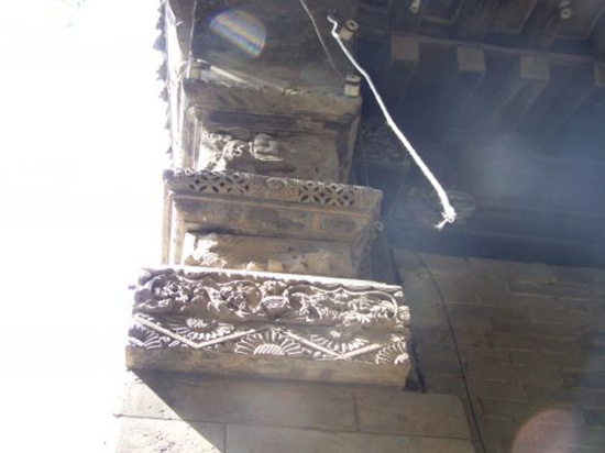 另個一處比較精美的墀頭為張坊故居二進院主房上的西側(cè)墀頭,它的樣式基本和山陜甘會館的一樣,都是復式的,雕工非常精美,只不過這個墀頭損毀相對嚴重,兩個束腰部分均已毀壞,看不清雕的是何物件。但角石仍在,雕工出神入化。