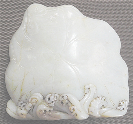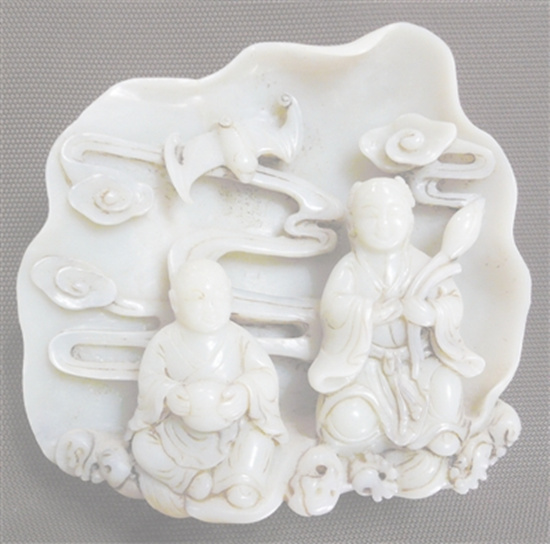 這件和合二仙玉雕擺件,高12.5厘米,寬14.5厘米,用和田白玉雕制而成,構思精巧,圖案生動,陰陽線的巧妙利用和細膩的拋光工藝,使得人物形象格外傳神,蝙蝠、荷葉、浪花活靈活現(xiàn),其中的寓意更是讓人過目難忘。