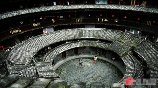 “高三層,樓四圈,上上下下四百間。圓中圓,圈中圈,歷經(jīng)滄桑數(shù)百年……”一首民謠道出了客家土樓的結(jié)構(gòu)和規(guī)模。它一層是廚房、飯?zhí),二層是倉(cāng)庫(kù)、糧倉(cāng),三層、四層是住室。院落中設(shè)祖祠廳堂,為家族敬佛祭祖、議事慶典的公共場(chǎng)所。一座樓僅有一座堅(jiān)固的大門(mén),防獸防匪防水火,一座大型土樓就是一個(gè)家族城堡,一個(gè)和諧小社會(huì),一個(gè)精神家園。