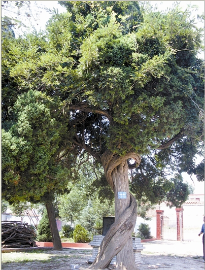 在汝陽縣劉店鎮(zhèn)紅里村小學院內(nèi),長著一棵刺柏。編號為“豫C0921”的刺柏樹高9.5米,樹圍1.7米,冠幅9米,樹齡300年。古柏長勢旺盛,蒼勁古樸,樹冠呈圓頭狀,樹旁有一棵紫藤盤繞著刺柏與其共生共長,訴說著悠久的人文歷史。