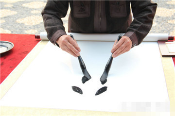2、從2000年,梁老師開始練習(xí)雙手齊書,經(jīng)過9年時(shí)間的練習(xí),2009年,他從雙手只能寫同樣的字到雙手同時(shí)寫不一樣的字,而且花樣翻新,隨心所欲。