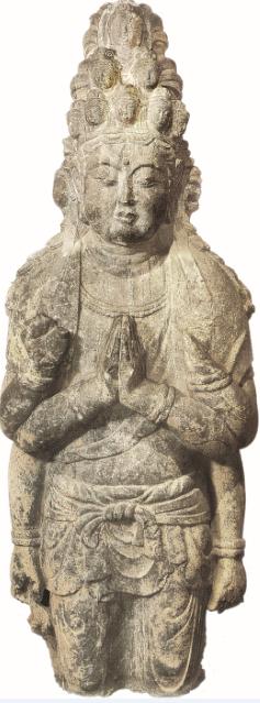 1976年3月滎陽大海寺舊址出土的菩薩造像之一。膝以下殘缺,存高1.71米。高發(fā)髻,面相豐滿圓潤,有白毫。發(fā)髻正面刻8個(gè)小頭像,最上面的是高肉髻佛像頭,其下7個(gè)作菩薩裝束。左耳后刻兇相面,右耳后刻善相面。上身穿衫,飾項(xiàng)圈,戴臂釧、手鐲,腰束長裙,挽結(jié)于腹前。肩雕六臂,其中兩手合十于胸前,作說法相,兩臂下垂于體側(cè)。雕刻細(xì)致,肌膚豐滿,質(zhì)感強(qiáng)烈,形象準(zhǔn)確,體態(tài)嚴(yán)肅大方,衣紋皺褶清晰,線條陰陽相間層次分明,過渡自然而又嚴(yán)謹(jǐn)。