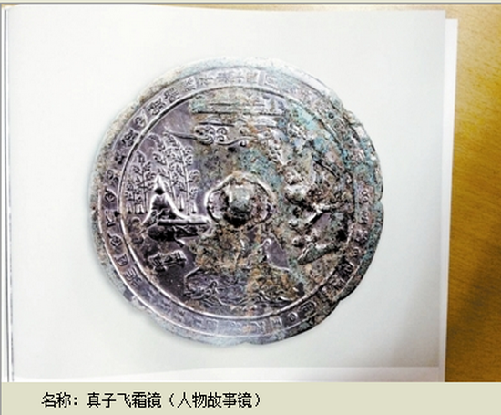 名稱:真子飛霜鏡(人物故事鏡)形狀:八出葵花形。直徑22厘米,邊緣厚0.7厘米,重1240克。 出土?xí)r間:2009年。出土地點(diǎn):洛陽(yáng)。收藏單位:洛陽(yáng)市文物考古研究院。