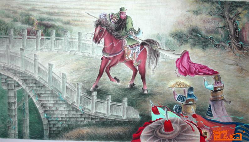 一日曹操擁漢獻(xiàn)帝縱馬圍獵于“射鹿臺(tái)”,劉、關(guān)、張陪同于后。忽草叢中趕起一兔,劉備一箭射去,正中那兔。獻(xiàn)帝喝彩。轉(zhuǎn)過(guò)土坡,忽見(jiàn)荊棘叢中趕出一只大鹿。獻(xiàn)帝連射三箭不中,顧謂曹曰:“卿射之。”曹討天子寶雕弓、金鈚箭,扣滿一射,正中鹿背,倒以草中。群臣將校,見(jiàn)了金鈚箭,只道是天子射中,都踴躍向漢獻(xiàn)帝山呼“萬(wàn)歲”。曹操縱馬直出,走在了漢獻(xiàn)帝的前面,關(guān)羽一見(jiàn)此景,大怒,豎起臥蠶眉,睜開(kāi)丹鳳眼,提刀拍馬便出,被劉備急忙止住……